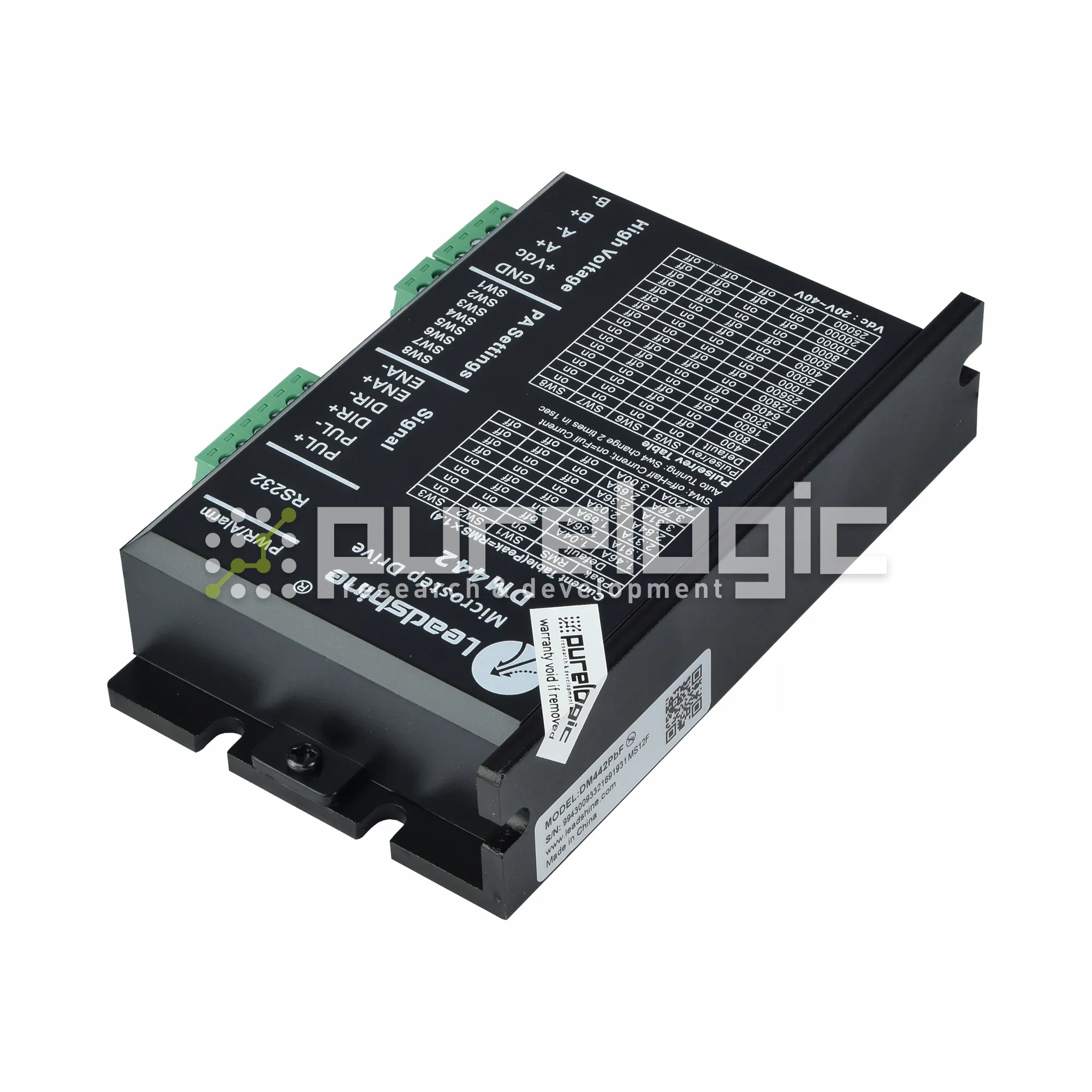 Драйвер шагового двигателя Leadshine DM442 40В/4.2А/200кГц. 16 режимов деления шага от 1:2 до 1:512. Оптоизолированные входы управления STEP, DIR, ENABLE. Выбор режима работы STEP/DIR или CW/CCW. Настройка драйвера с ПК через RS232, автонастройка под ШД. Компенсация резонанса. Защита от КЗ обмоток ШД, от обратной ЭДС ШД, режим удержания ротора ШД.