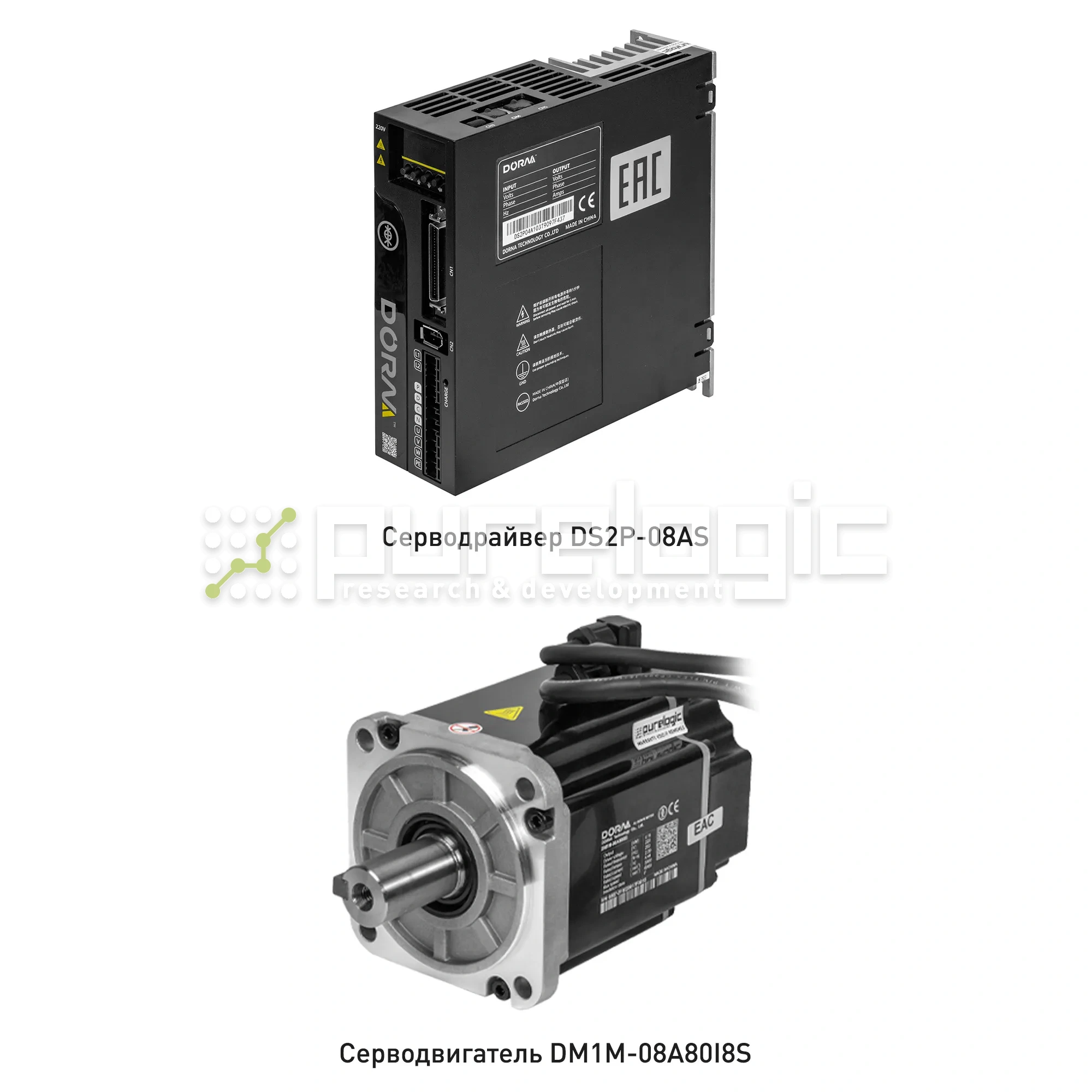 Комплект сервопривода DORNA DM1M-08A80I8S включает серводвигатель, серводрайвер и кабельные разъемы для подключения. Номинальная мощность серводвигателя составляет 750Вт, питание – 220VAC. В составе используется абсолютный однооборотный энкодер 17-bit, обеспечивающий обратную связь при управлении положением, скоростью и моментом. Серводрайвер поддерживает импульсное управление STEP/DIR с частотой до 500кГц, оснащен оптоизолированными входами и интерфейсом RS-485 для настройки параметров. Привод совместим с системами ЧПУ PUMOTIX, Mach3/4, LinuxCNC и другими контроллерами при использовании импульсного управления. Силовые и сигнальные кабели в комплект не входят и приобретаются отдельно.