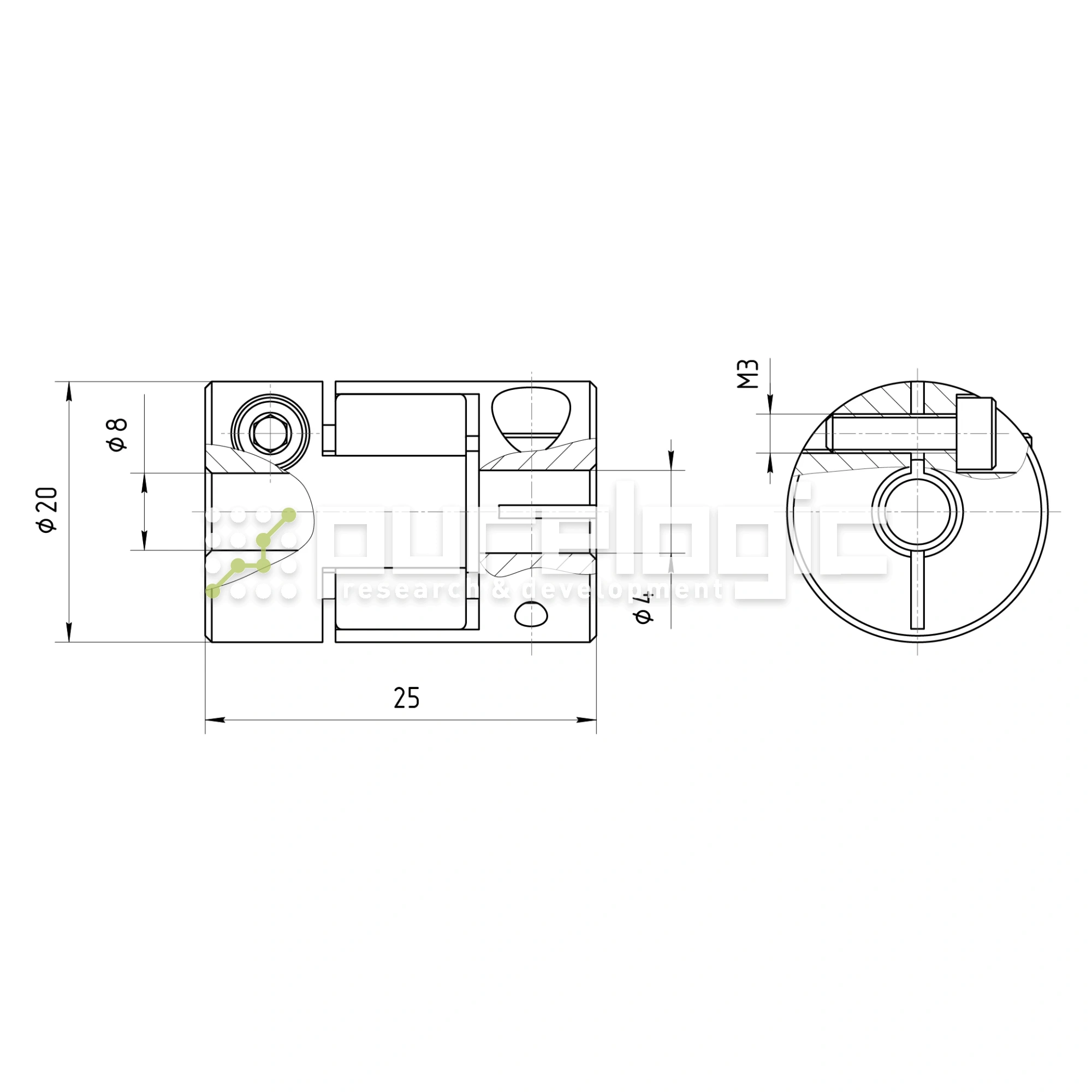 Корпус разборный, две полумуфты из алюминиевого сплава соединены амортизирующей полиуретановой вставкой. Фиксируются на валу затяжкой, с помощью винта. Муфта применяется в узлах, где требуются компенсации несоосности валов и угла между валами. Передает высокий крутящий момент, поглощает вибрации. При высокой нагрузке, полиуретановая вставка подвержена нормальному износу, в передаче может возникать люфт. D=20мм, L=25мм, d1=4мм, d2=8мм, момент 3Н*м.