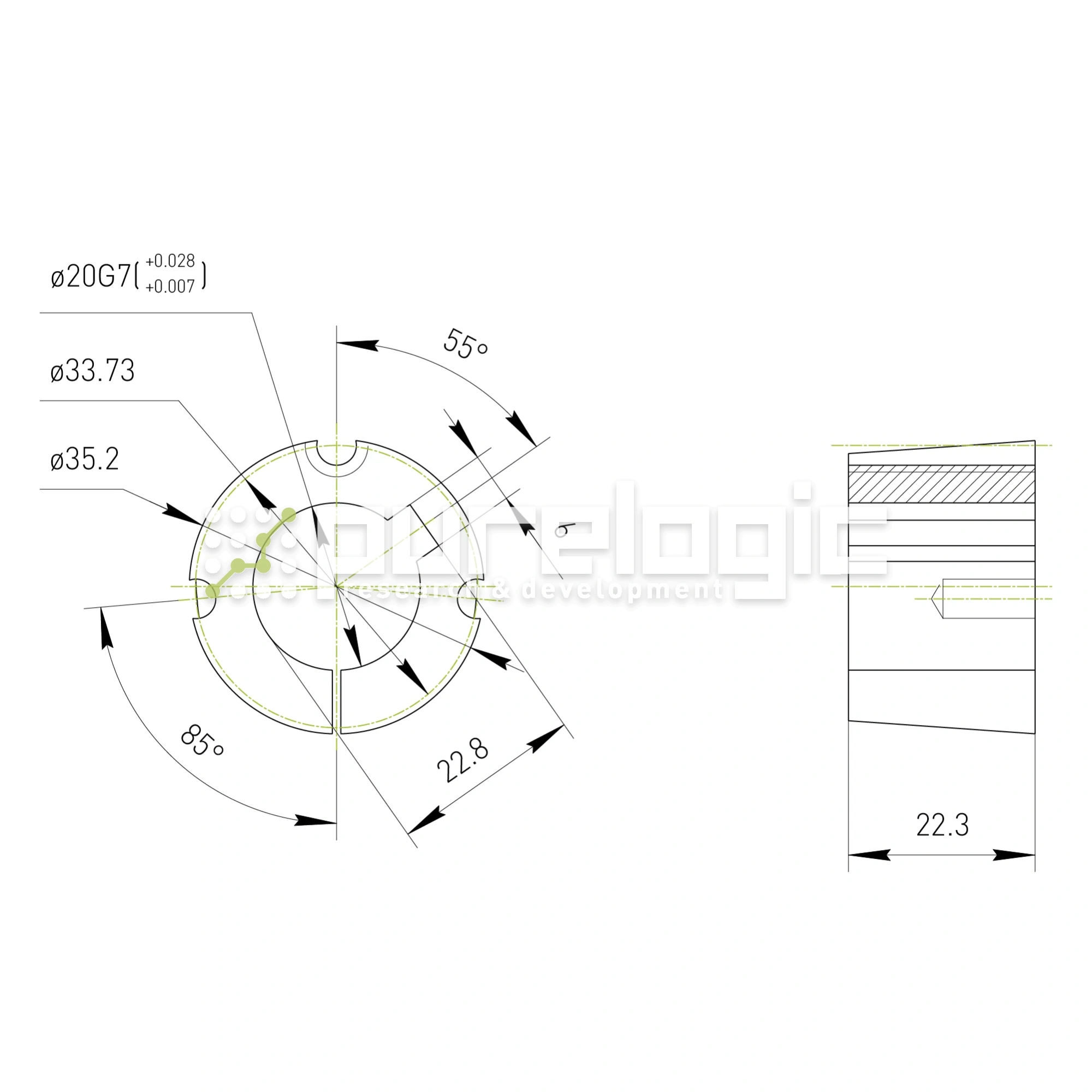 Коническая втулка тапербуш со шпоночным пазом для быстрой смены и крепления на валу звездочек, шкивов, муфт, ступиц и других элементов трансмиссии. Втулка изготовлена из чугуна GG20. Фиксируется 2 винтами посредством шестигранного ключа 1/8", окончательная затяжка динамометрическим ключом с усилием 5.6Нм. Передаваемый крутящий момент 136Нм. Больший диаметр конуса D1=35.2мм, меньший диаметр конуса D2=33.73мм, внутренний диаметр d1=20мм, ширина втулки 22.3мм, ширина шпоночной канавки 6мм.