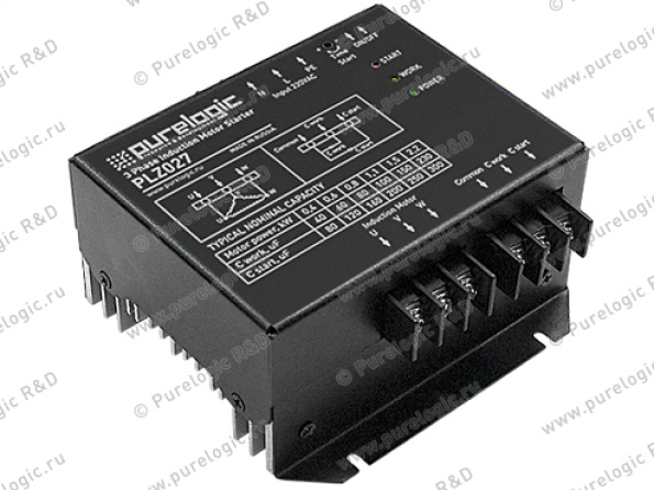Модуль PLZ027 предназначен для запуска 3-х фазных асинхронных двигателей от однофазной сети переменного тока ~220В. Максимальная мощность электродвигателя 2200Вт. Блок запуска состоит из электронного модуля с подключенными пусковым и рабочим конденсаторами. Емкости конденсаторов подбираются пропорционально мощности электродвигателя, согласно инструкции.