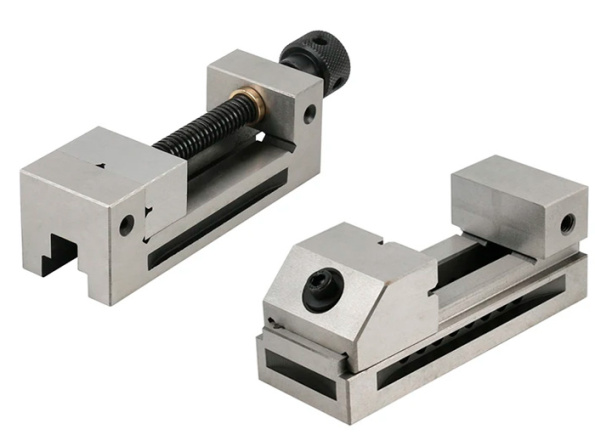 Выбор в пользу той или иной модели зависит от задачи. Для точных операций с возможностью кантования деталей лучше подходят тиски без выступающих винтов, такие как QKG80. Их преимущество в том, что они обеспечивают более гибкую работу с заготовками, особенно при ручной разметке или мелких операциях на магнитной плите. Тиски подобные QGG80 подходят для стандартных фрезерных операций и имеют классическую схему зажима, что делает их удобными для большинства работ, где не требуется частое изменение плоскости положения детали.
